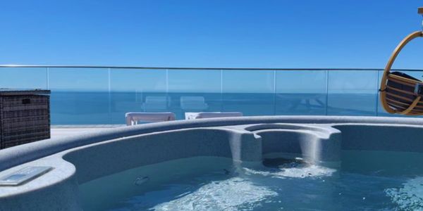 Rooftop seating with panoramic views and a personal hot tub.
